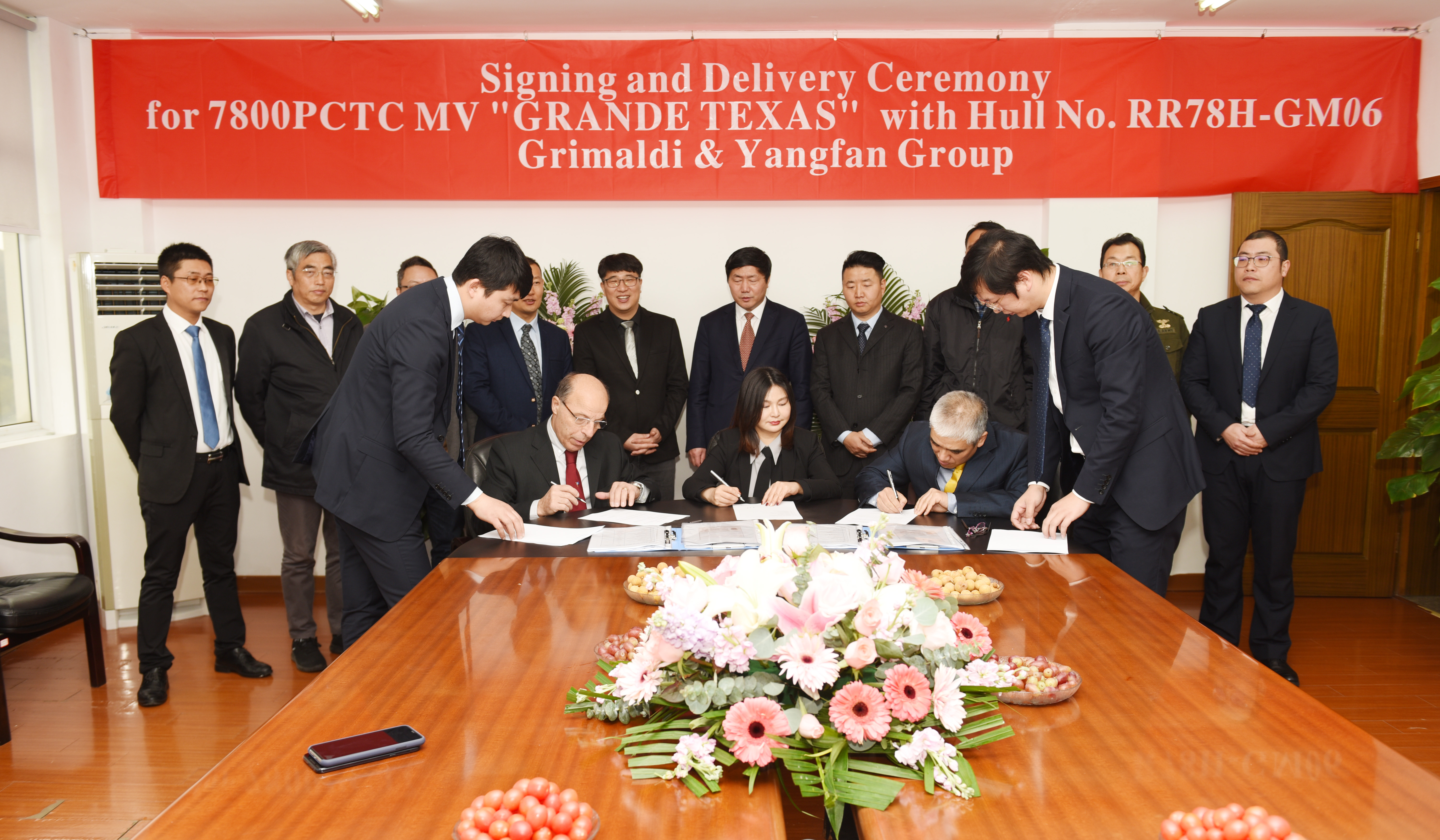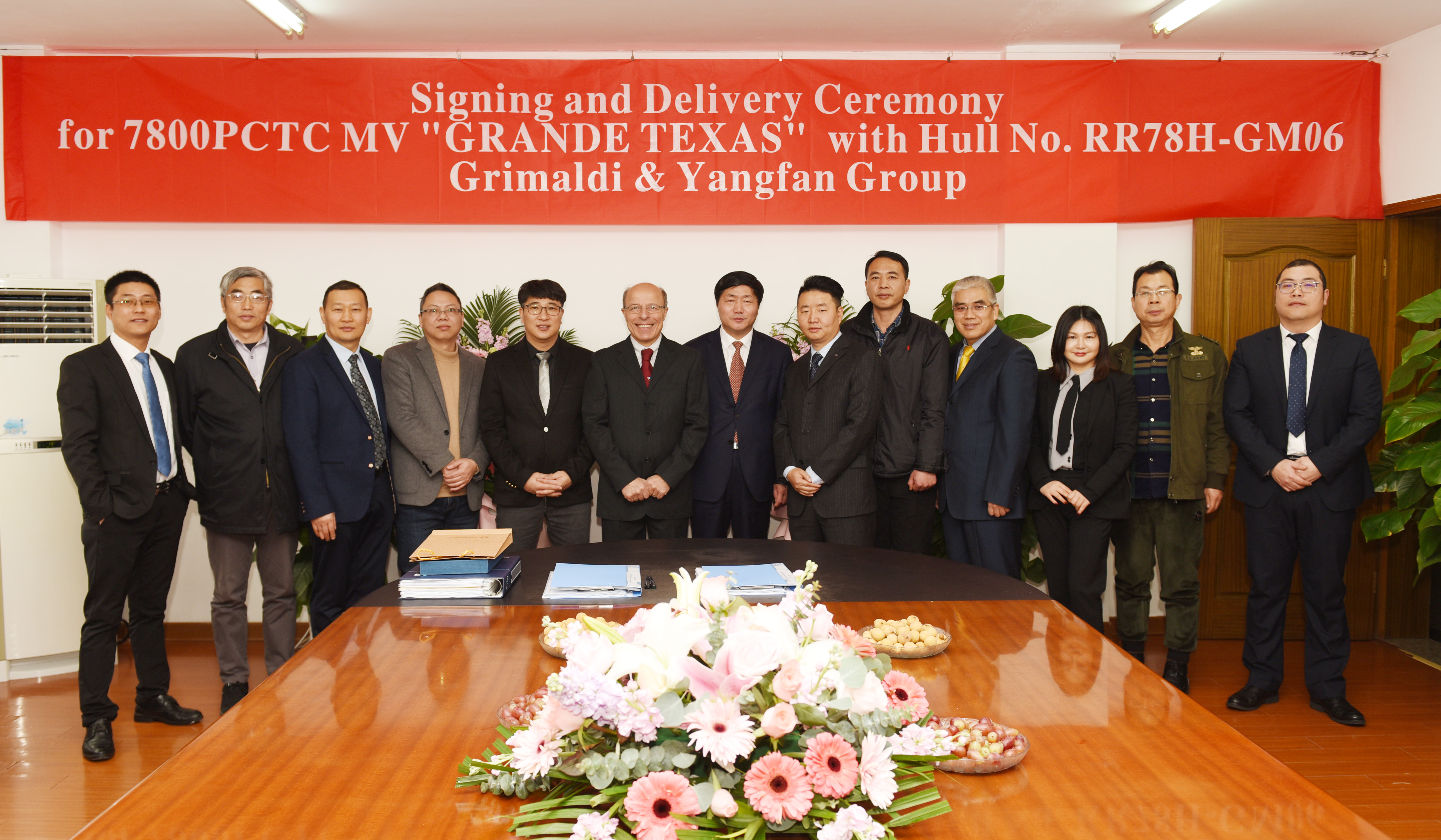 2021年1月26日,由揚帆集團股份有限公司下屬全資子公司——浙江東海岸船業有限公司為意大利船東Grimaldi集團公司承建的7800車位汽車滾裝船(PCTC)系列船“GRANDE TEXAS"”(船號GM06)正式簽字交付。